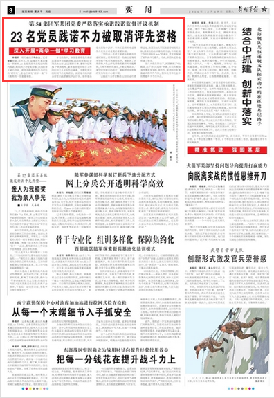 中國軍網(wǎng)北京12月17日電第54集團軍某團前不久爆出一則新聞:23名黨員因未在規(guī)定時限內(nèi)踐諾,被取消立功受獎資格。該團政委王斌介紹說,將黨員踐諾情況作為評先的“硬杠杠”,是他們深化“兩學一做”學習教育的一項重要舉措。
