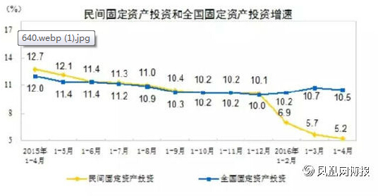 圖中的藍(lán)線,是“全國固定資產(chǎn)投資增速”的走勢;黃線是“民間固定資產(chǎn)投資增速”的走勢。很明顯,兩根線在去年12月突然分手了。