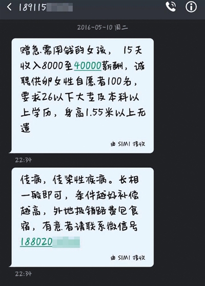 • 2016年05月15日 01:55 來源:新京報 原標(biāo)題:“求卵”短信群發(fā)大學(xué)生稱15天掙4萬
