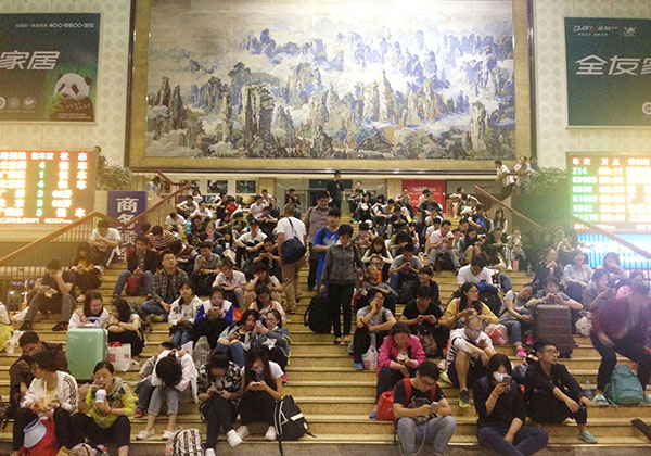 2016年5月2日,湖南長沙,五一小長假最后一天,近凌晨零點(diǎn),湖南長沙火車站人滿為患,原本用于進(jìn)出候車室的樓梯也有數(shù)百名旅客席地而坐。
