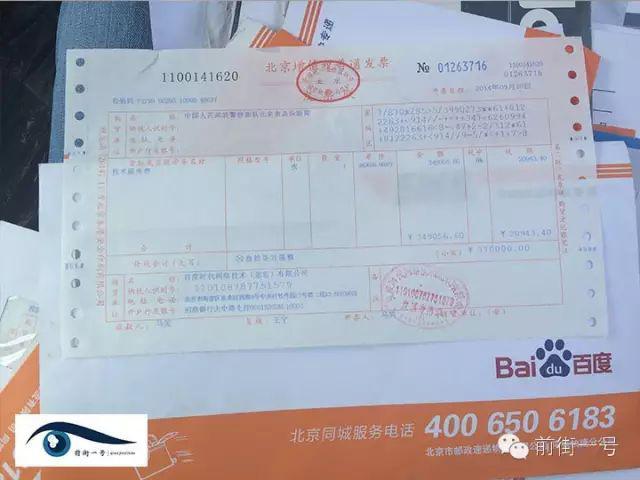 前街一號 記者獲取的7份發(fā)票顯示,武警北京總隊醫(yī)院在2014年6~10月的4個多月中,向百度花費(fèi)113萬元購買“技術(shù)服務(wù)費(fèi)”。接近百度的業(yè)內(nèi)人士透露,百度提供給醫(yī)療單位的“技術(shù)服務(wù)費(fèi)”,基本可以斷定指推廣費(fèi)。記者看到的發(fā)票被裝在EMS特快專遞的文件袋內(nèi),文件袋的右下方有百度公司標(biāo)志。文件袋上張貼的業(yè)務(wù)詳情單顯示,寄件人為“財務(wù)”,地址一欄用藍(lán)色打印字顯示為“百度時代網(wǎng)絡(luò)技術(shù)(北京)有限公司”,收件人為商某某,收件地址為北京朝陽區(qū)東三里屯社區(qū)東6號樓x單元xx號中國人民武裝警察部隊北京市總隊醫(yī)院。文件袋內(nèi)有一張37萬元的發(fā)票。發(fā)票顯示購貨單位為“中國人民武裝警察部隊北京市總隊醫(yī)院”,銷貨單位名稱為“百度時代網(wǎng)絡(luò)技術(shù)(北京)有限公司”。發(fā)票中貨物或應(yīng)稅勞務(wù)名稱一欄中顯示為“技術(shù)服務(wù)費(fèi)”,價稅合計37萬元整。發(fā)票上蓋有國家稅務(wù)總局全國統(tǒng)一發(fā)票監(jiān)制章,并有百度時代網(wǎng)絡(luò)技術(shù)(北京)有限公司印章,開票時間顯示為2014年9月 20日。