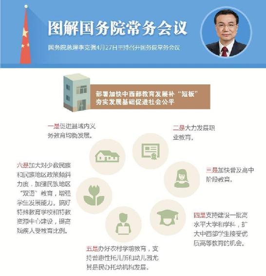 國務院總理李克強4月27日主持召開國務院常務會議,部署加快中西部教育發(fā)展補“短板”,夯實發(fā)展基礎、促進社會公平。會議指出,加快中西部教育發(fā)展,把提升最貧困地區(qū)教育供給能力和最困難人群受教育水平作為重點任務。會議確定了加快中西部教育發(fā)展的六項措施。