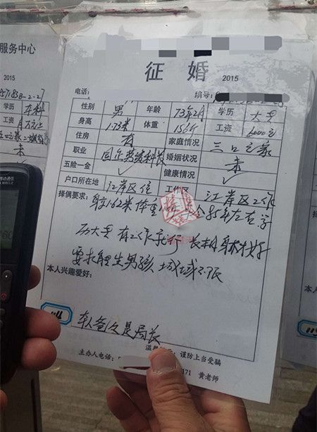 下午,楚天都市報記者來到解放公園內(nèi)的征婚角,懸掛著上百張征婚啟事,有很多市民或是幫子女,或是幫朋友找尋合適的對象。記者找到了嚴(yán)先生覺得很奇葩的征婚啟事,在啟事?lián)衽家笠粰?,征婚者胡先生要求女方“能生男孩”。并且,在啟事的最后,胡先生還說明“本人爸爸是局長”。