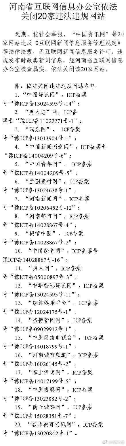 • 河南省網(wǎng)信辦依法關(guān)閉“中國(guó)資訊網(wǎng)”等20家違法違規(guī)網(wǎng)站